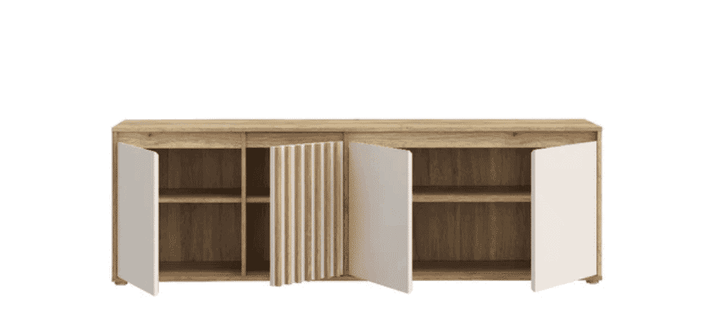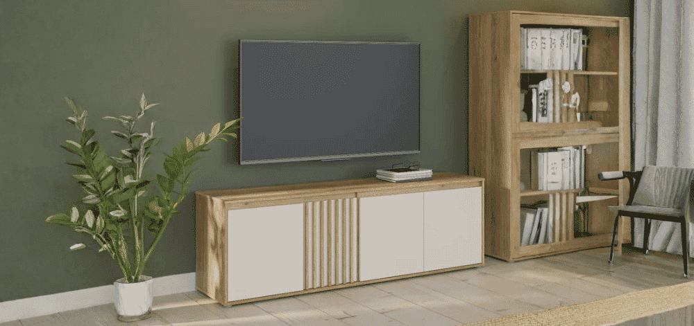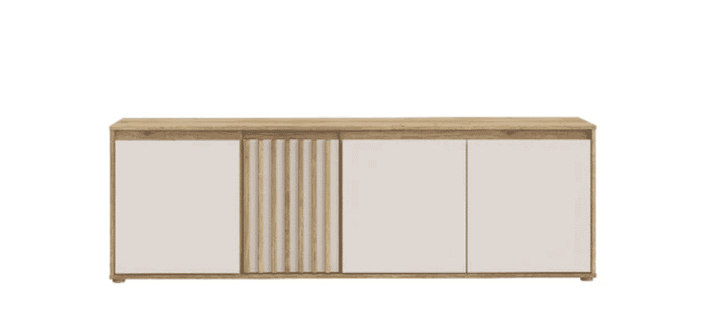 TV komoda ELISTON – tai modernus ir funkcionalus baldas, puikiai tinkantis tiek svetainei, tiek bendrai gyvenamajai erdvei. Natūralaus medžio dekoras ir švelnios, šviesios durelės suteikia jaukumo, o vertikalios dekoratyvinės juostos prideda išskirtinio charakterio.