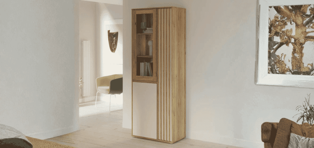 Aukšta vitrina ELISTON – tai estetiškas ir funkcionalus sprendimas, suteikiantis interjerui tvarkos ir jaukumo pojūtį.