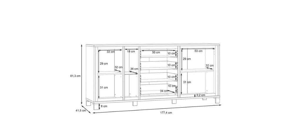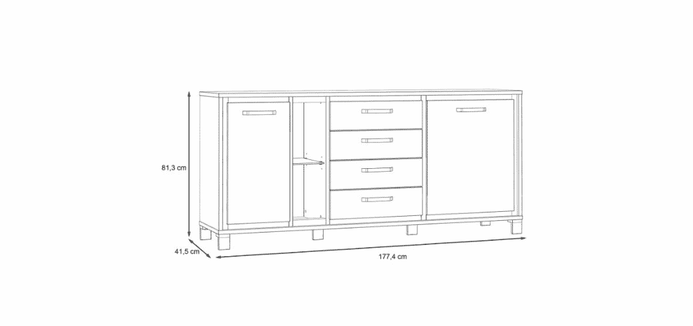Matmenys: 177,4 cm (plotis) x 41,5 cm (gylis) x 81,3 cm (aukštis),