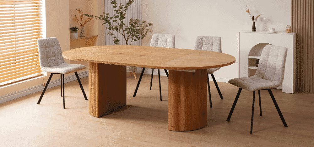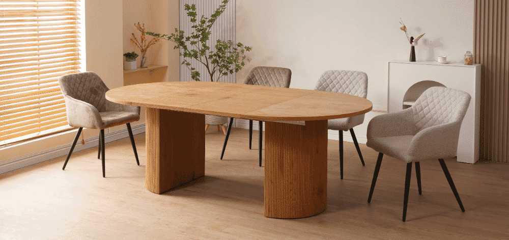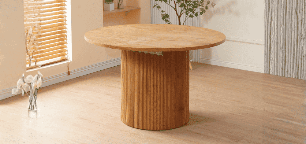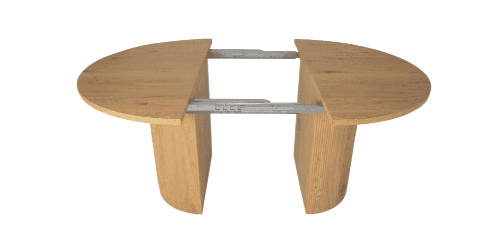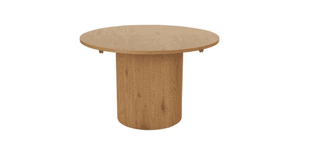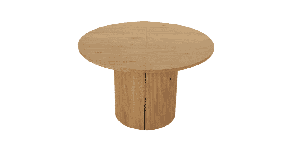 Valgomojo stalas COVE – išskirtinio dizaino, elegantiškas ir funkcionalus baldas, kuris taps jūsų valgomojo akcentu. Apvalus stalviršis suteikia jaukumo ir bendrystės jausmą, o išskleidus stalą, kolonijinė koja prasiskiria į dvi dalis, išlaikydama stabilumą bei simetrišką estetiką. Šviesaus medžio imitacijos paviršius suteikia šilumos ir natūralumo pojūtį.