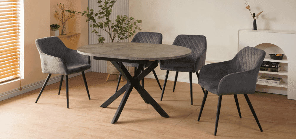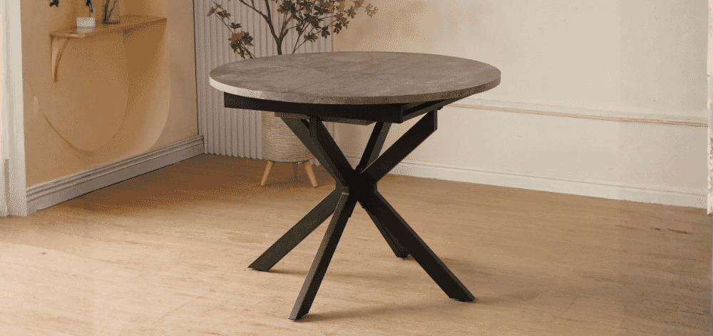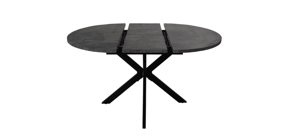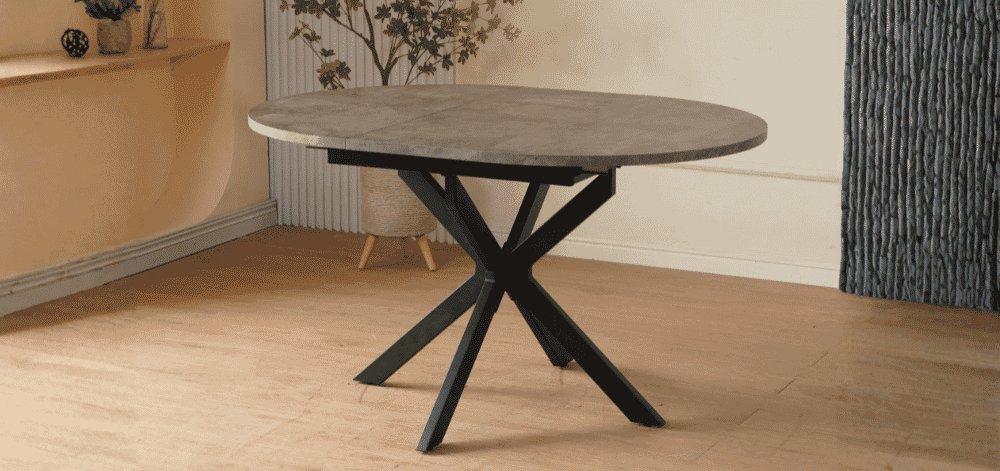 Valgomojo stalas LARK – šiuolaikiško dizaino, kompaktiškas ir praktiškas baldas, puikiai tinkantis moderniam ar industrinio stiliaus interjerui. Apvalus stalviršis iš 25 mm MDF plokštės padengtas betono imitacijos danga, kuri suteikia subtilaus tvirtumo ir išskirtinumo pojūtį. Juodos metalo kojos užtikrina stabilumą ir vizualinį kontrastą, o padidinimo funkcija leidžia greitai pritaikyti stalą didesniam svečių skaičiui.