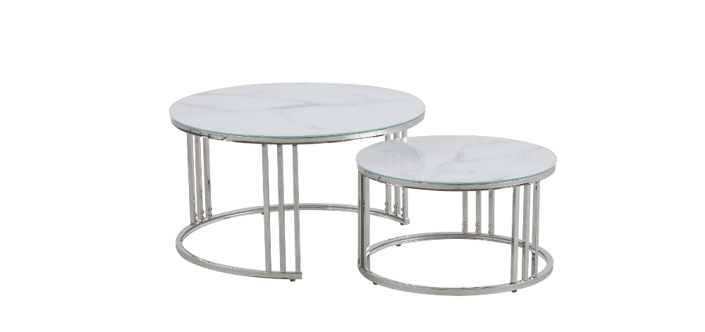 Kavos staliukų komplektas STAPLE – elegantiškas ir funkcionalus pasirinkimas šiuolaikiniam interjerui. Du skirtingo dydžio staliukai suteikia galimybę kurti įvairias kompozicijas pagal poreikį – juos galima statyti atskirai arba vieną po kitu. Stalviršis iš 8 mm grūdinto stiklo bei chromo spalvos metalinės kojos sukuria modernų, lengvą ir prabangų įvaizdį.